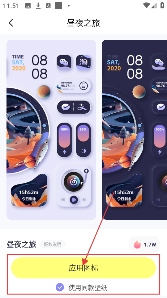 2、进入图标主题详情页,点击【应用图标】按钮,即可应用该主题的图标啦。