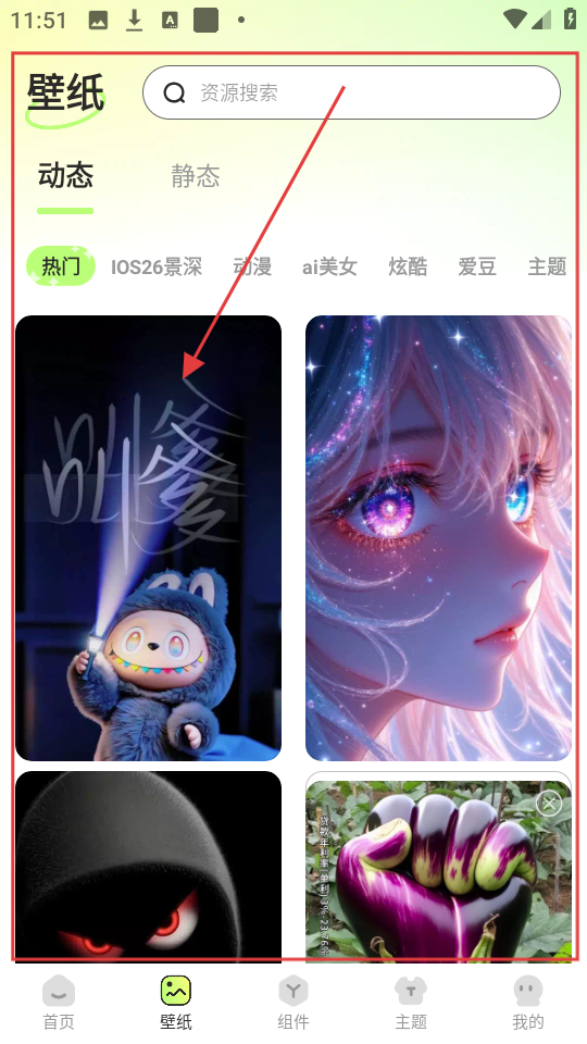 3、切换到壁纸页面,可看到动态、静态等分类的壁纸,挑选喜欢的点击进入哦。
