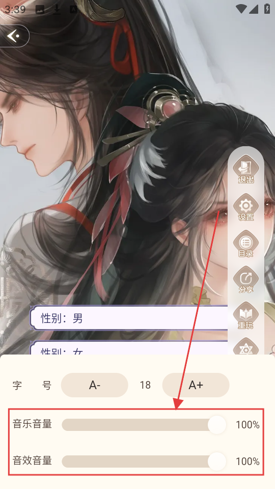 4、进入设置界面后,可调整音乐音量和音效音量的大小,调整后就能获得更舒适的听觉体验啦。