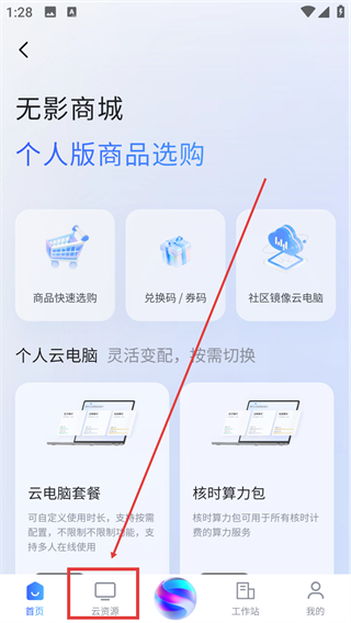 1、在【无影商城】首页点击底部的【云资源】按钮,就能进入云资源相关的功能页面,开始了解云服务啦。