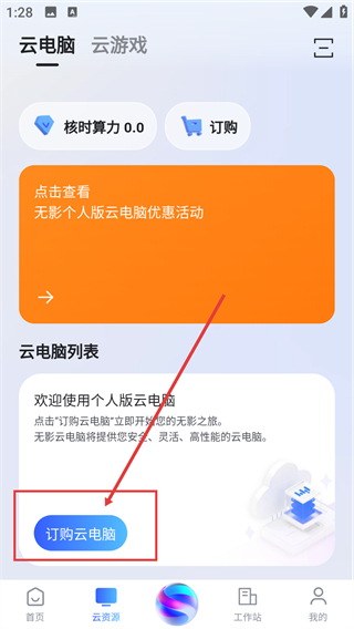 2、进入【云资源】页面后,点击【订购云电脑】按钮,就能进入订购/兑换的选择界面,继续操作咯。