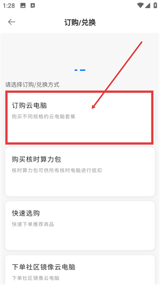 3、在【订购/兑换】页面选择【订购云电脑】选项,就能进入对应的套餐选择界面,挑选合适的配置啦。
