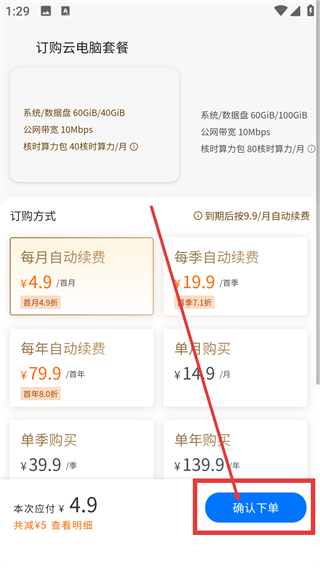 4、选好云电脑套餐和订购方式后,点击【确认下单】按钮,就能完成本次云电脑套餐的订购流程啦。