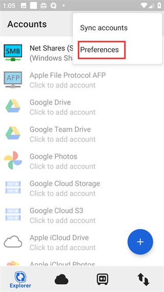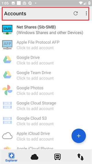 1、进入【Accounts】界面,我点击右上角三点按钮,可展开功能选项菜单哦。