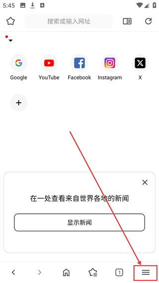 1、在浏览器首页点右下角的菜单按钮,可展开功能列表,找到设置相关的操作入口哦。
