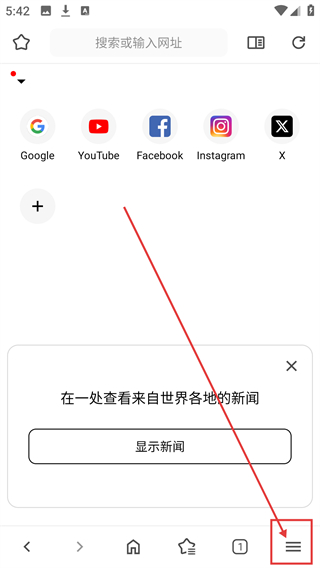 1、进入浏览器主页后,点击右下角的菜单按钮,就能展开功能选项栏,找到更多实用工具啦。