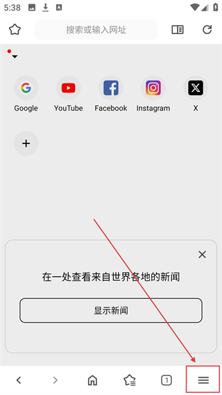 1、在浏览器首页,点击底部的菜单按钮,展开功能选项列表,可找到设置等管理入口啦。
