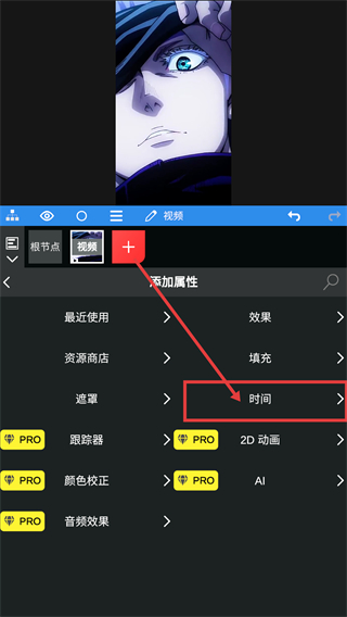 2、进入添加属性菜单后,点击【时间】选项,就能进入时间相关的属性设置界面,调整视频的时间参数哦。