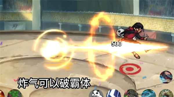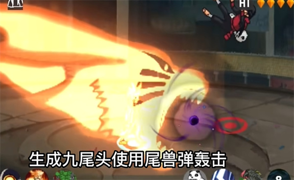 4、奥义:召唤九喇嘛使用尾兽弹自身使用螺旋手里剑,造成大范围的伤害。