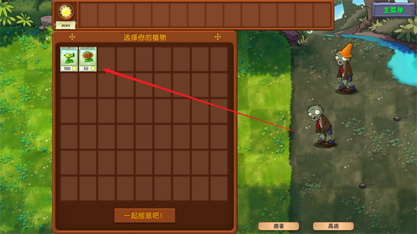 3、通过点击的方式来将自己的植物卡牌进行装备,右侧还能够看到关卡之中需要面对的僵尸种类。