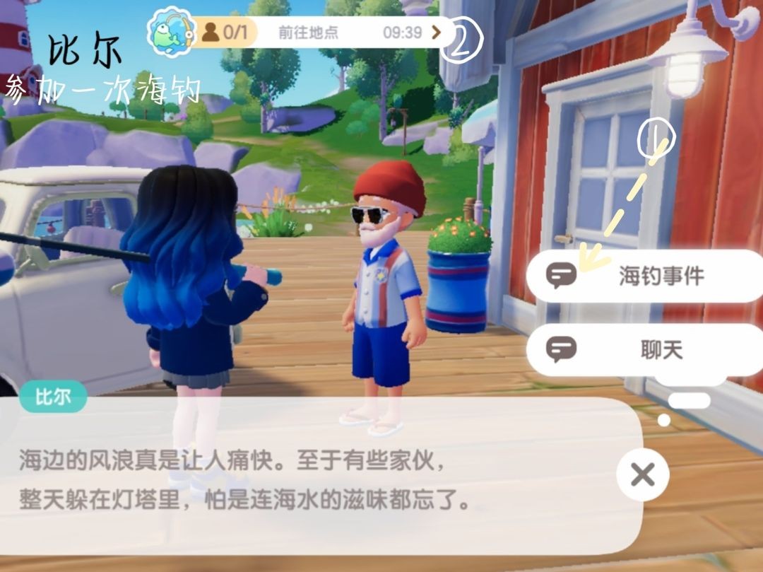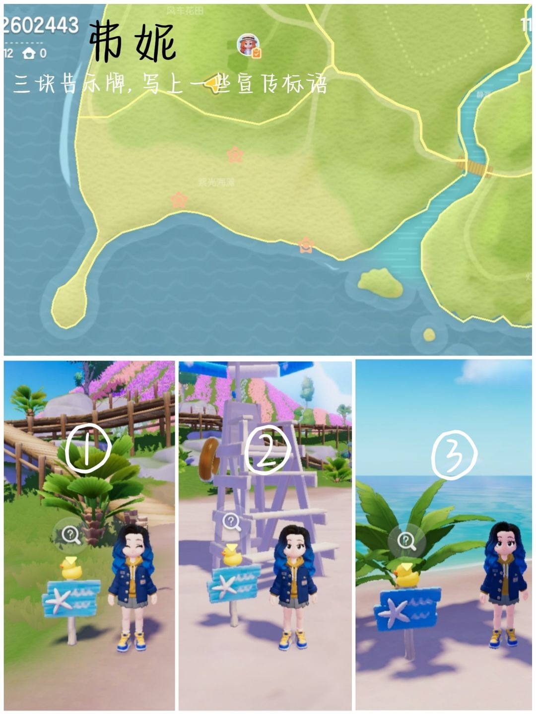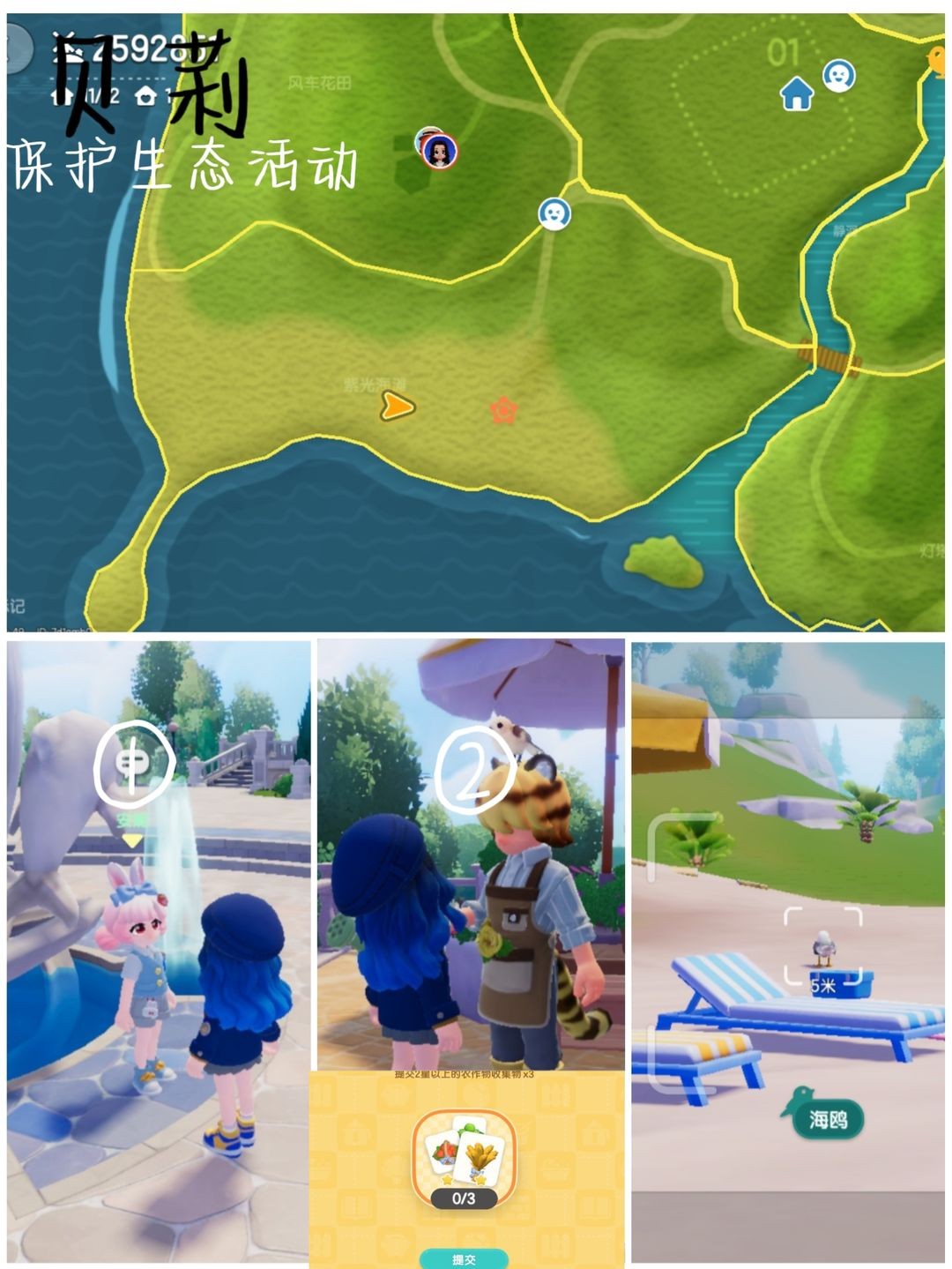 12、和①②聊天,再向②提交两星以上的农物,最后到地图所标的小红花那里拍海鸥