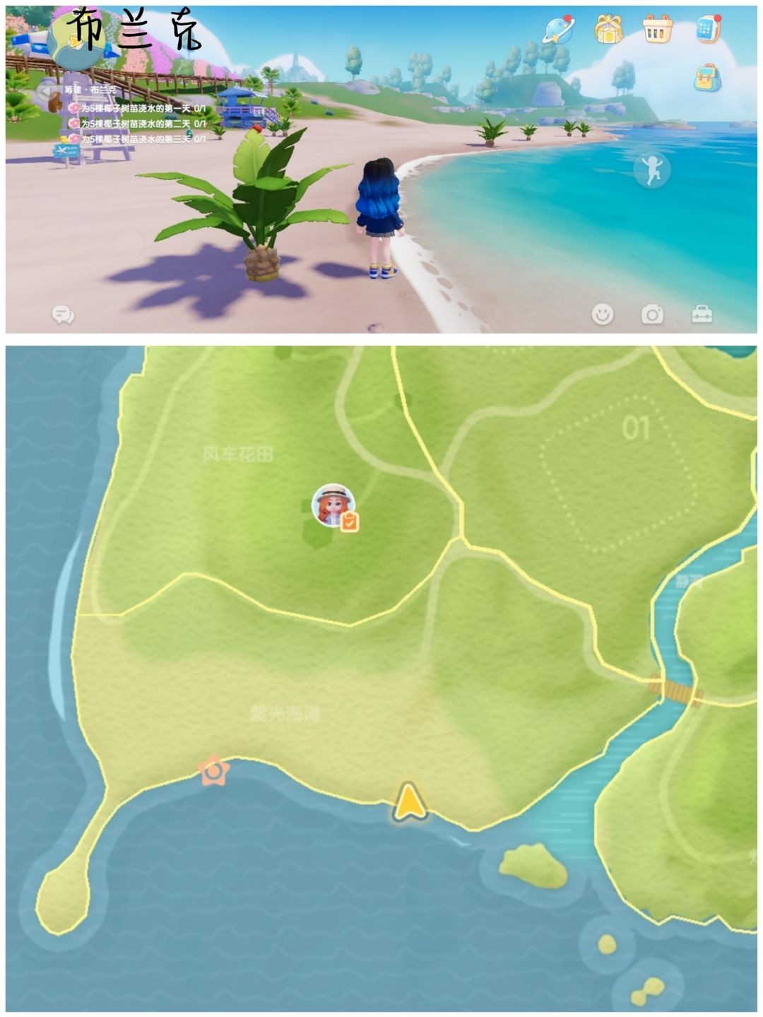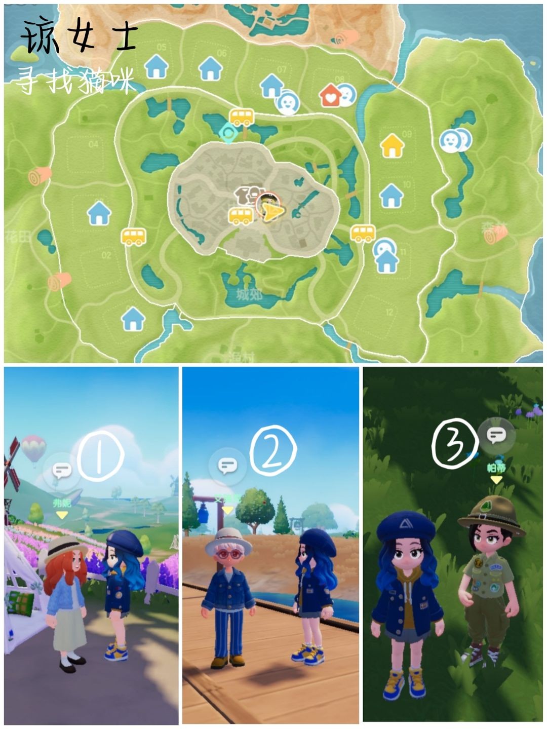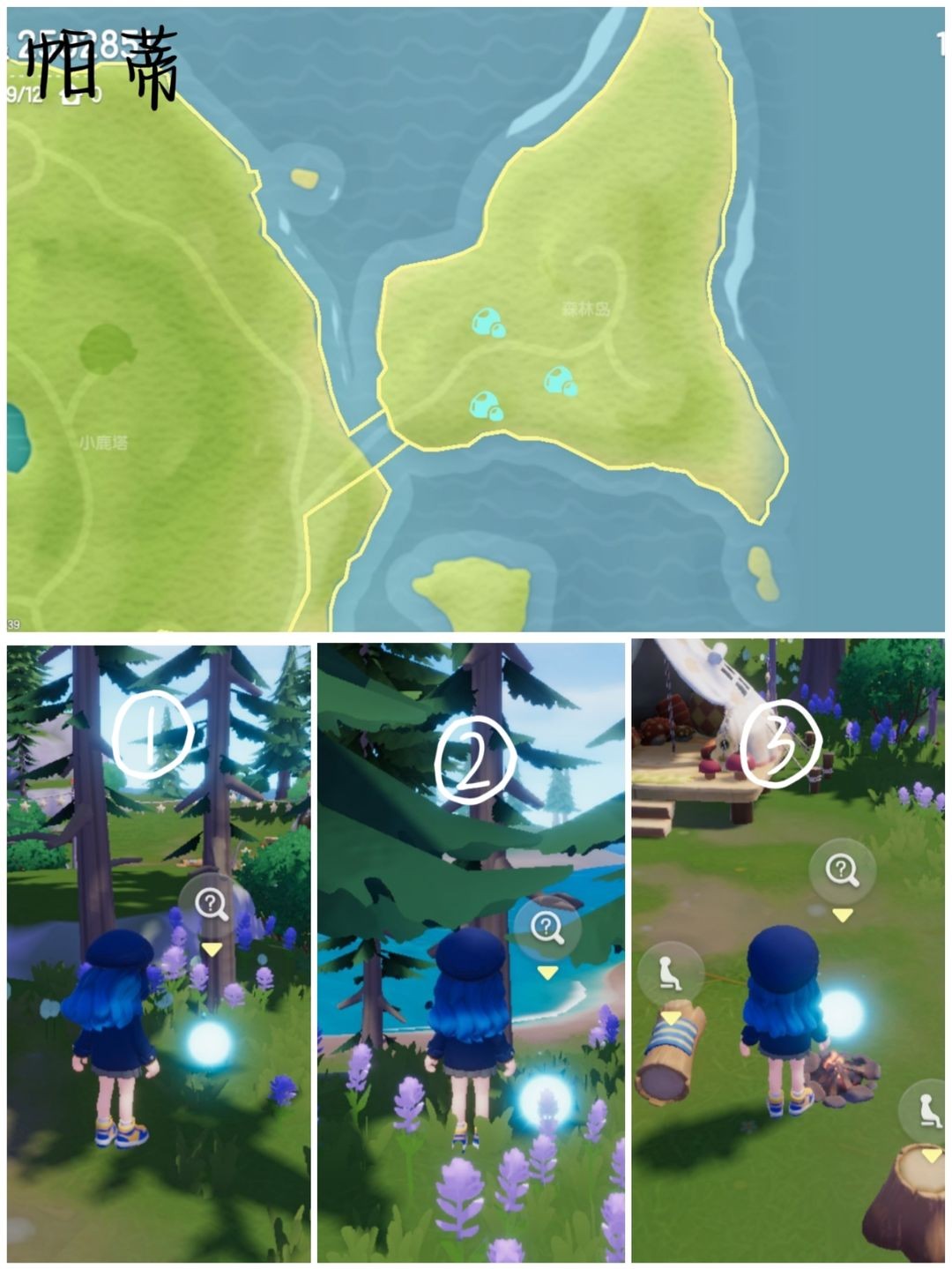 12、和①②聊天,再向②提交两星以上的农物,最后到地图所标的小红花那里拍海鸥