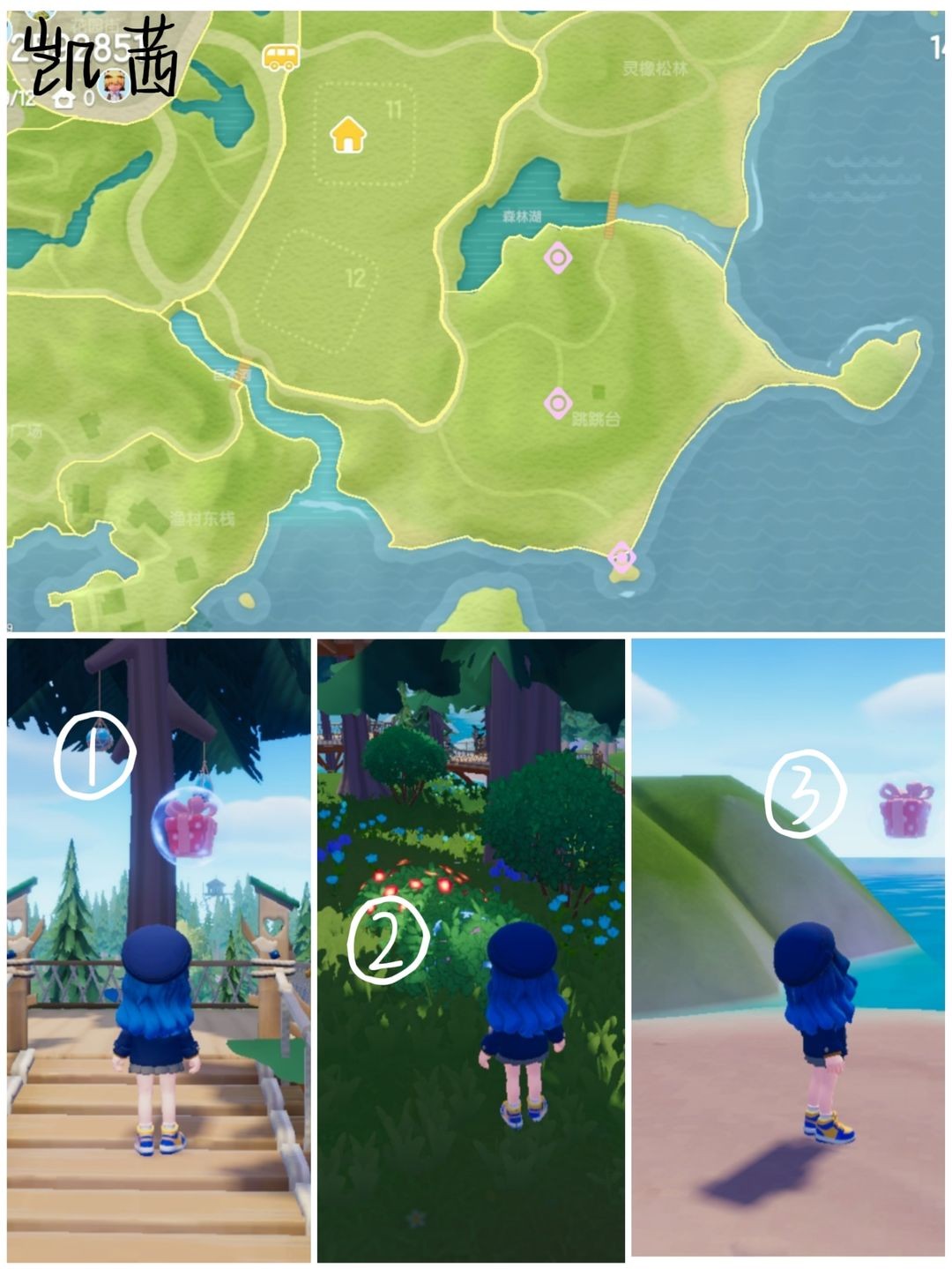 16、先领取任务,分别到①②③那里去完成任务,完成任务后到地图所标小红花找账本(①—气球,②—溜溜橡木,③—无暇萤石)