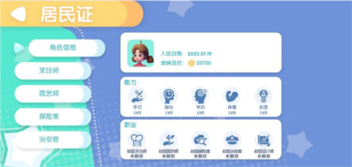 2、屏幕右侧的居民证可查看角色当前的能力等级与职业等级,努力提升自己吧!