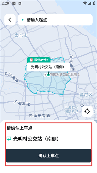 2、进入起点页面后,确认系统推荐的【光明村公交站(南侧)】,点击【确认上车点】就能锁定起点位置哦。