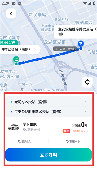 4、确认起点和目的地后,看到【萝卜快跑】的预估信息,点击【立即呼叫】就能发起车辆呼叫啦。