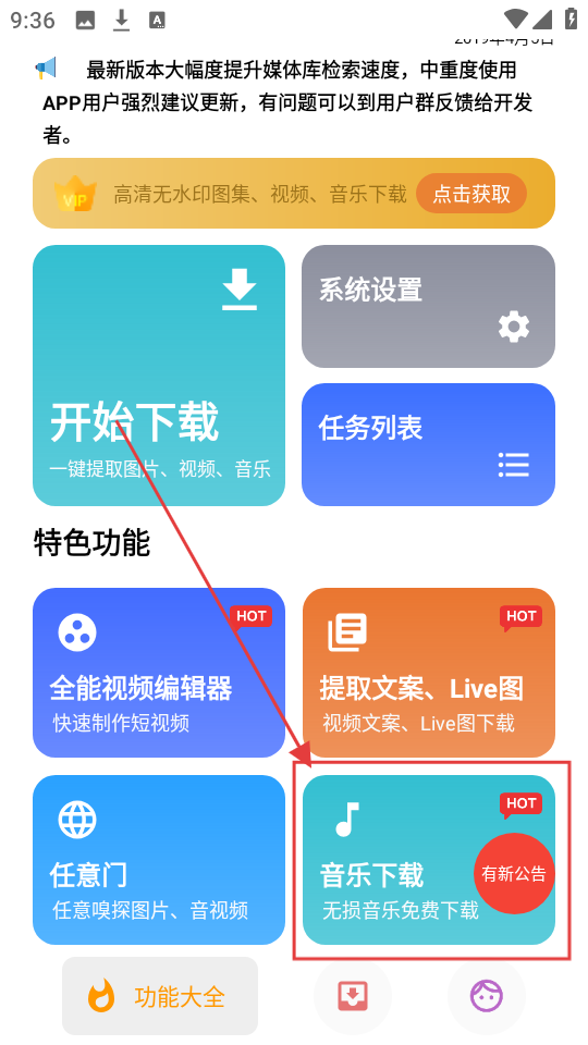 1、在便捷下载主界面,找到特色功能区的【音乐下载】按钮,点击它就能进入音乐下载器界面啦。
