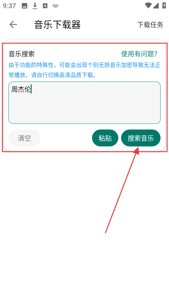2、进入音乐下载器后,在搜索框输入歌手名,像【周杰伦】,再点击【搜索音乐】按钮,就能搜索音乐啦。