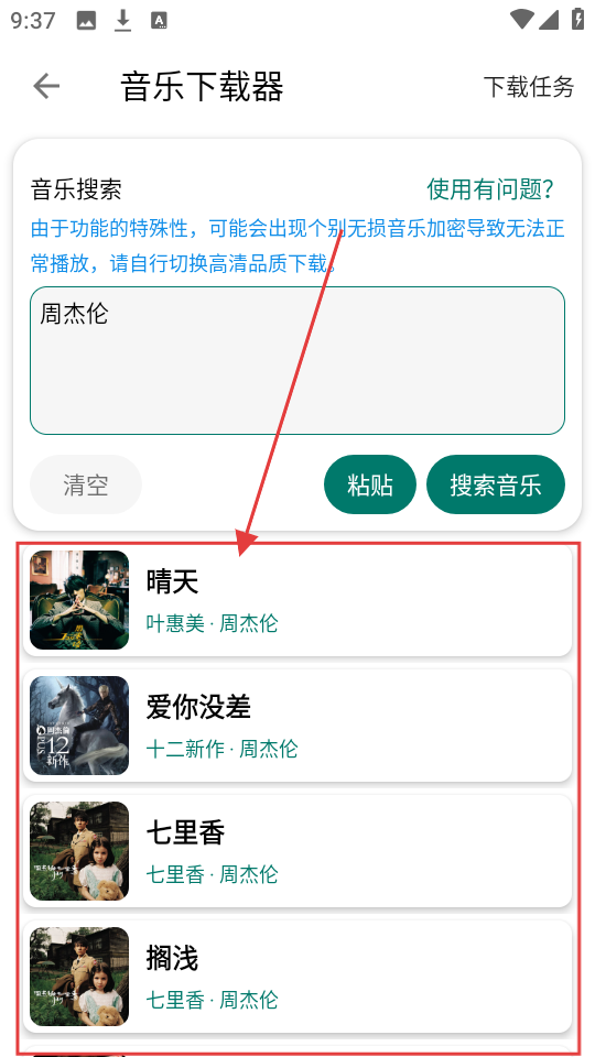 3、搜索完成后,会出现相关歌曲列表,挑选你想要下载的歌曲,点击它就能进行下载操作啦。