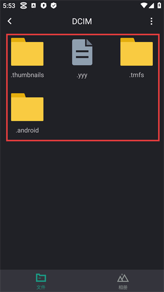 3、进入【DCIM】文件夹,可见【.thumbnails】【.yyy】【.tmfs】【.android】等子文件夹/文件。