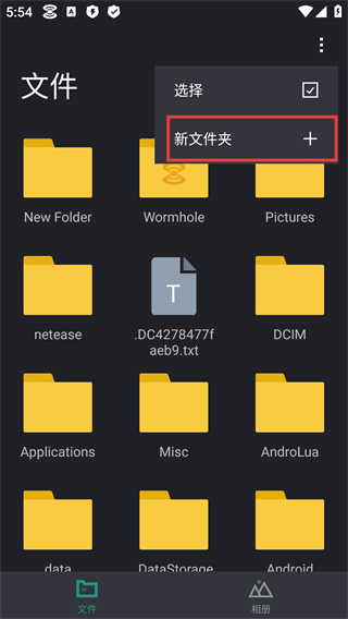 2、【文件】页面点击右上角菜单,选择红框标注的【新文件夹】+按钮,执行新建文件夹操作。