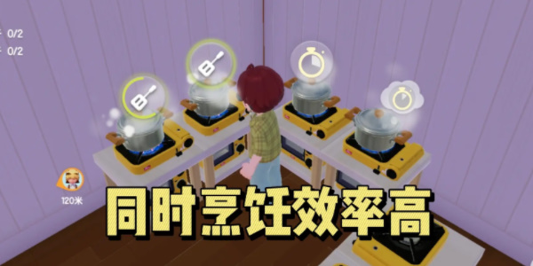 2、采集完果子后回到家中,可以同时摆放6个灶台进行烹饪,从而提高烹饪效率。