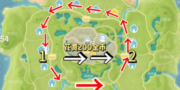 1、玩家可以根据下图的路线在图中采集果子等食材原料,路线过长可以乘坐公交车前往。