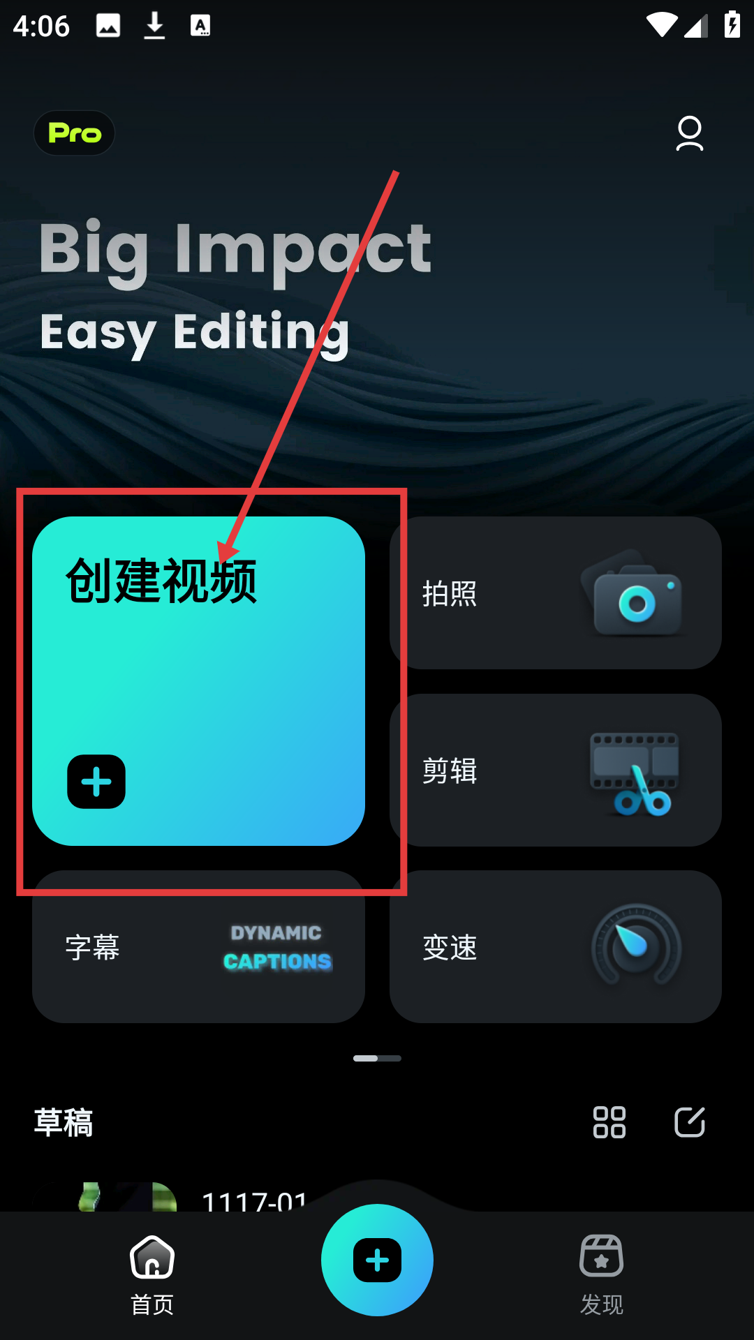 1、在APP首页,点击【创建视频】,可进入素材选择页面,准备导入视频素材开始编辑啦。