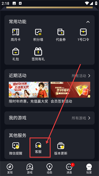 2、进入玩家页面后找到【客服】选项并点击,就能进入客服中心页面,咨询游戏相关的问题哦。