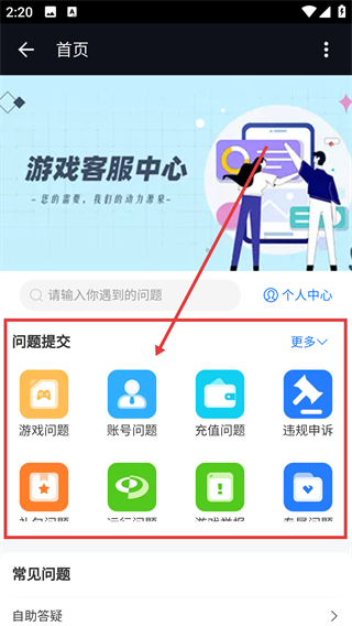 3、在客服中心页面的【问题提交】板块,可选择【游戏问题】【账号问题】等分类,提交对应的咨询内容。