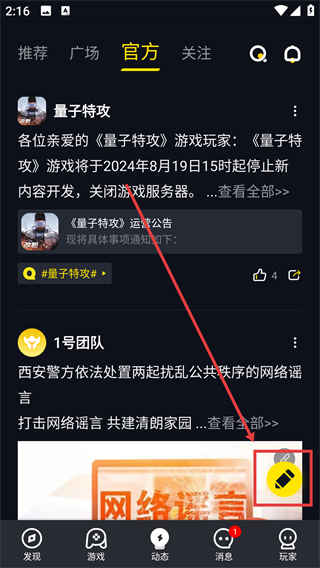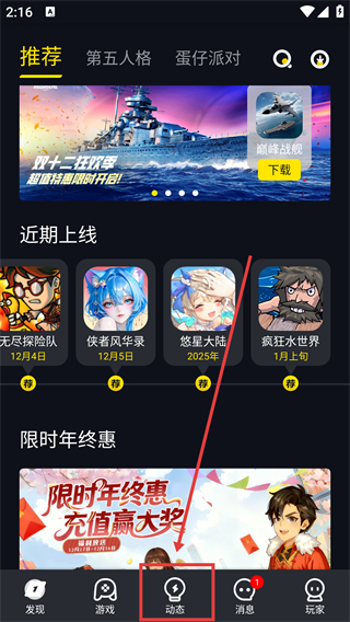 1、在主页面点击底部的【动态】选项,就能进入动态页面,查看各类游戏相关的资讯和动态啦。