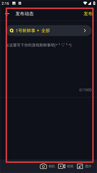 3、在发布动态页面填写内容,还能添加话题(比如【#1号新鲜事#】),编辑好后就能点击发布啦。