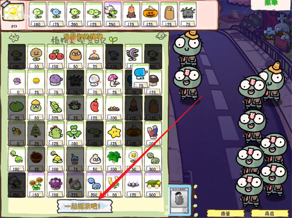 1、玩家们首先需要挑选自己出战的各种植物卡牌,并点击下方的一起摇滚吧来开始进行战斗。