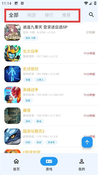 2、进入游戏页面后,顶部有【全部】【网游】等分类标签,默认展示全部游戏,可按需切换分类哦。