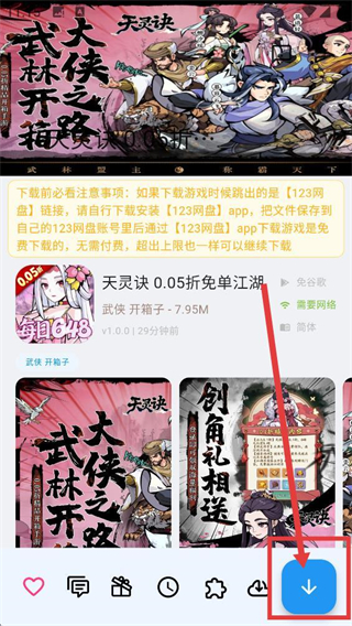 4、进入目标网游【天灵诀-0.05折免单江湖】的详情页,点击底部下载按钮,即可按提示获取该游戏咯。