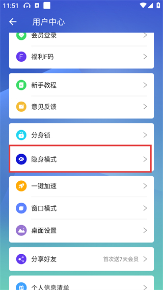 2、【用户中心】界面选择红框标注的【隐身模式】选项,进入该功能的专属设置流程。