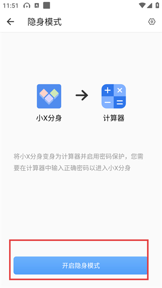 3、【隐身模式】界面点击红框【开启隐身模式】按钮,开启后分身将伪装为【计算器】需密码进入。