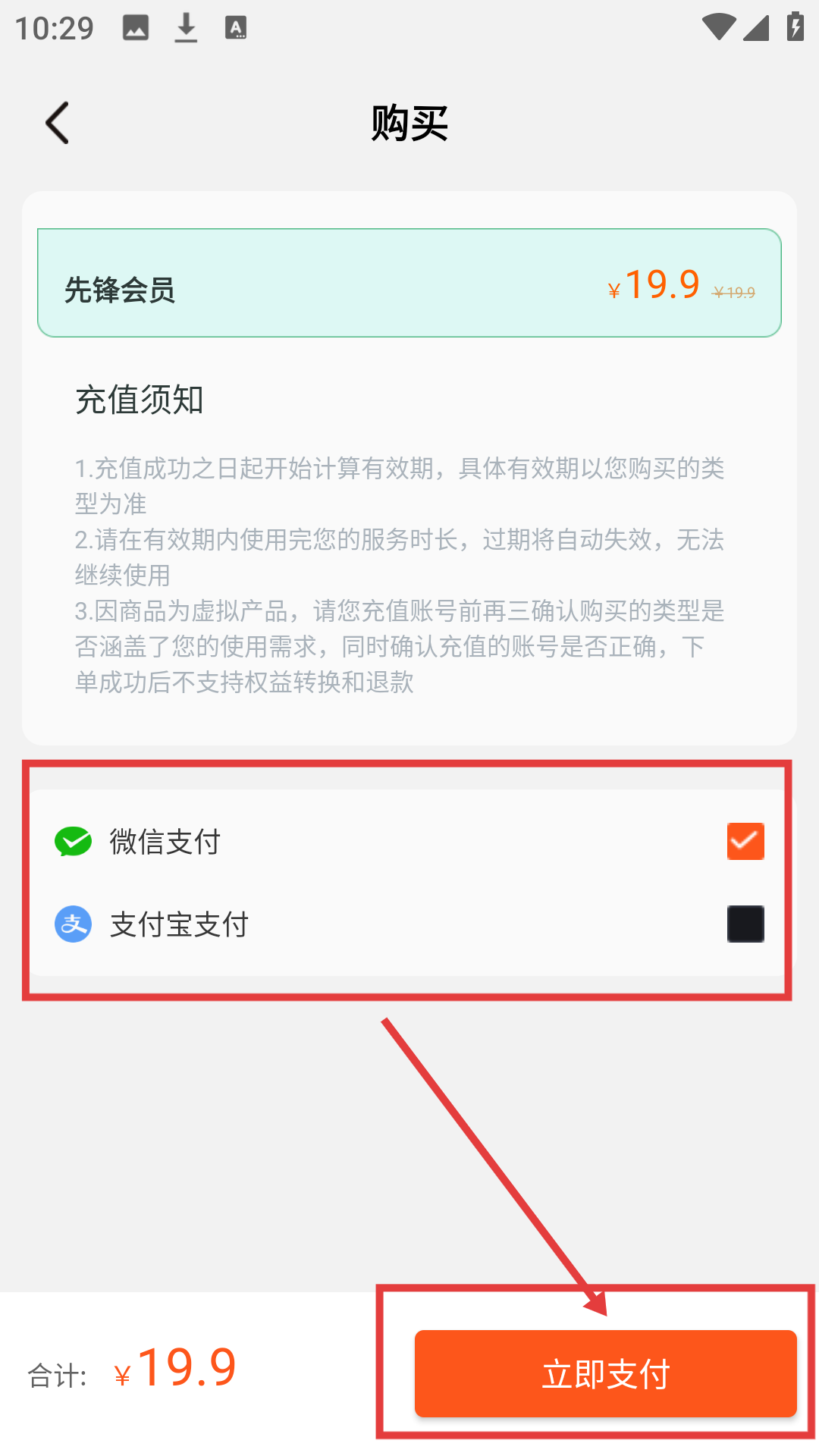 2、在会员购买界面选好会员类型后,点击【购买】,进入支付选择界面啦。