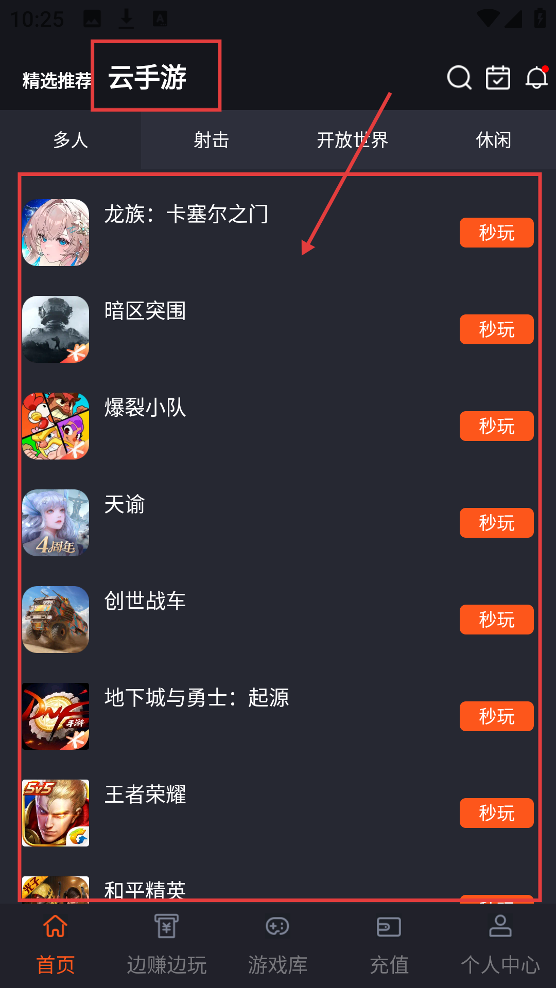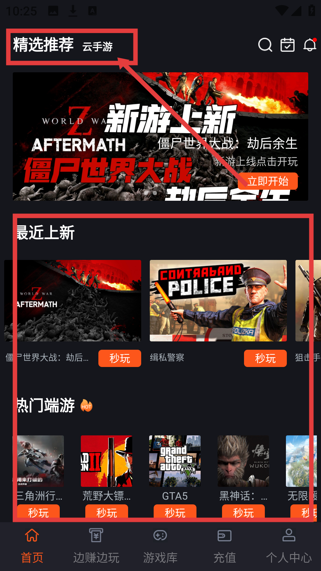 1、在APP首页,点击【云手游】,可进入云手游列表页面,准备选择想玩的云游戏啦。