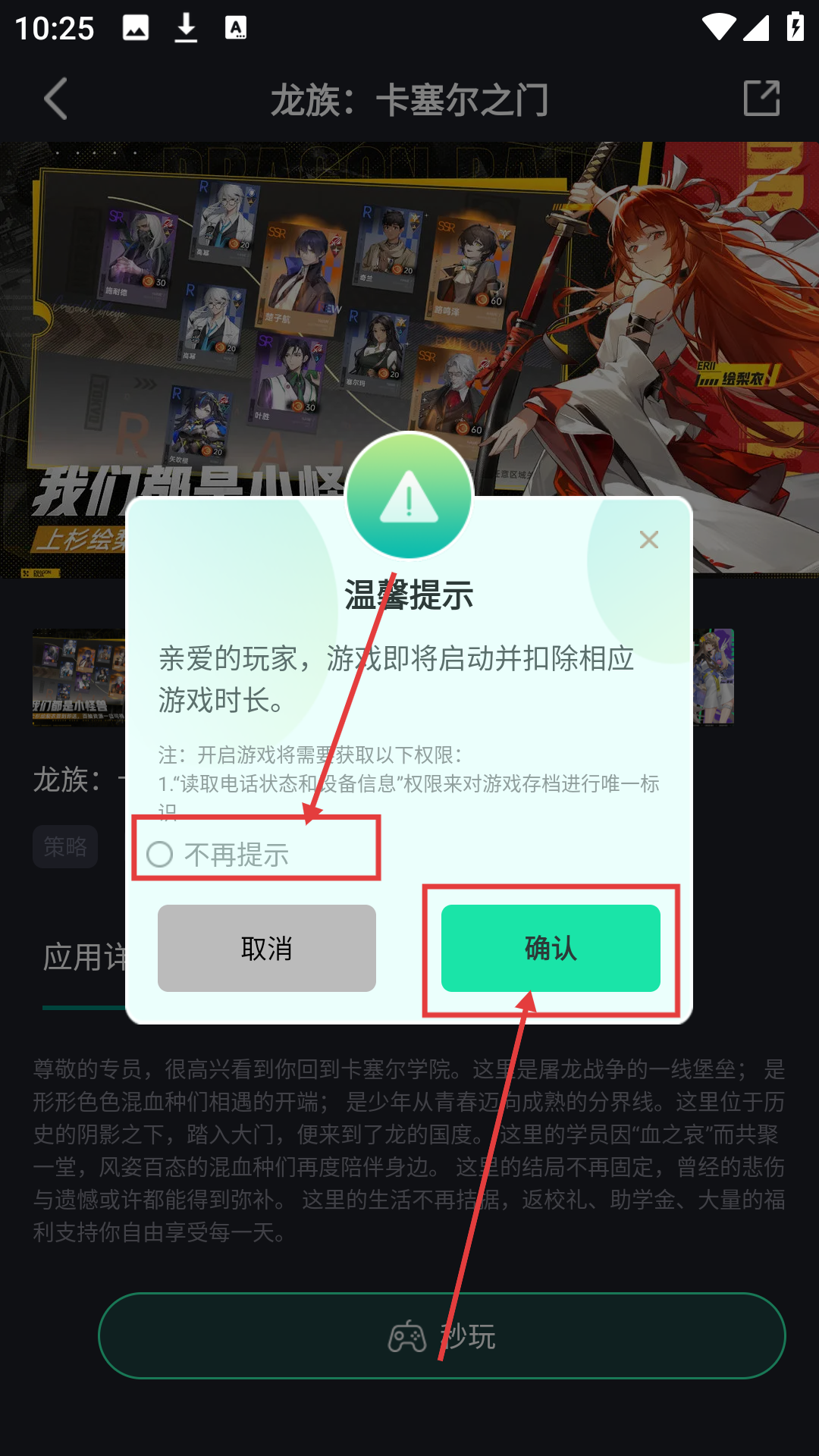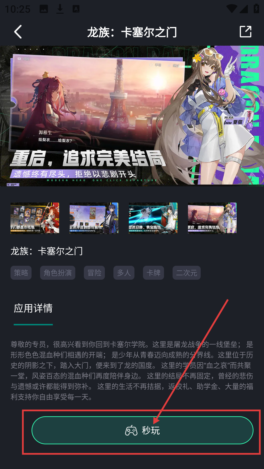 3、进入《龙族:卡塞尔之门》详情页后,点击【秒玩】,可触发游戏启动的温馨提示啦。