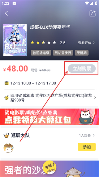 3、在漫展详情页点击【立刻购票】按钮,就能进入购票流程,不过要先完成登录才能继续操作啦。