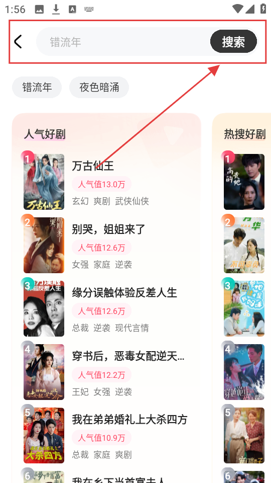1、在软件首页,点击顶部搜索框,输入要查找的短剧名称,如错流年,可进行短剧搜索啦。