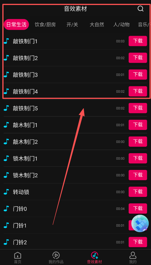 1、如果你在寻找特定音效,可以直接进入"音效素材"板块,这里素材已按"饮食/厨房"、"开/关"等场景分好类。