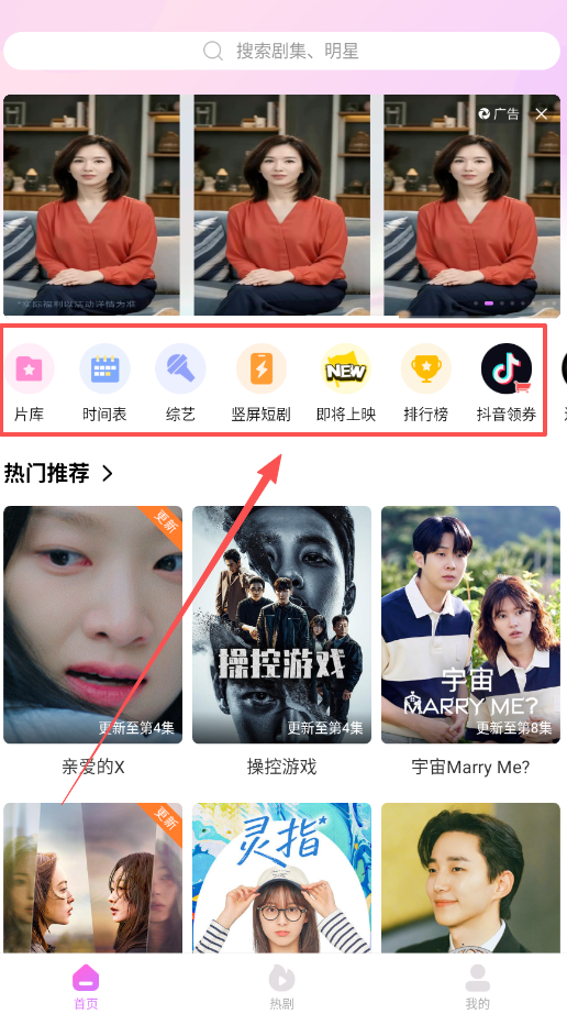 2、想找剧集的话,可以点击顶部的搜索框,直接输入名字,或者浏览下方的“片库”、“综艺”等分类。