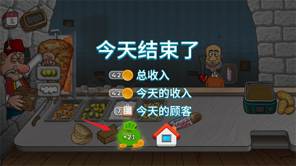 4、完成了一天的经营后,玩家们点击下方的绿色袋子也可以收取金币。