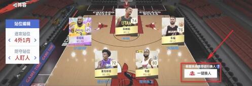 3、进入到【阵容】页面后点击【一键换人】功能,这样就能在比赛中换人了。