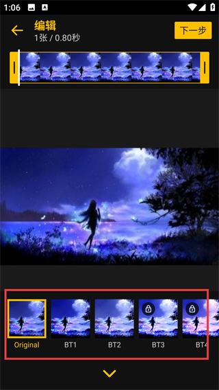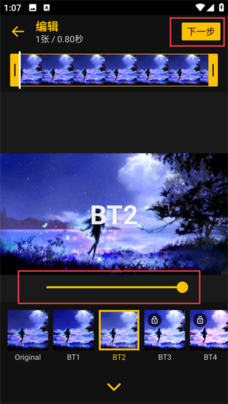 3、选好想要的特效(比如【BT2】)后,点击右上角的【下一步】按钮,就能进入分享保存环节啦。