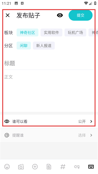 4、在发布帖子页选好板块和分区,填好标题与正文后,点【提交】就能发布自己的帖子啦。
