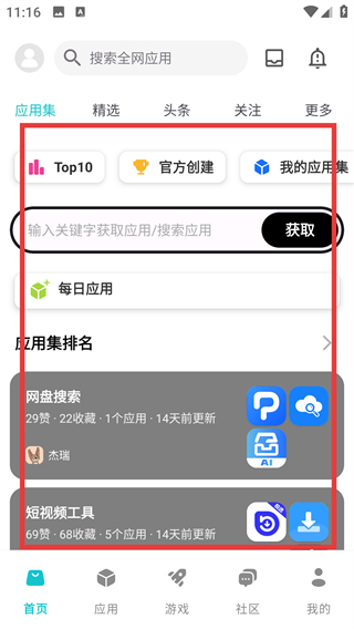 1、在首页的应用集区域找到目标应用集(比如【网盘搜索】),点击它就能进入对应的应用列表页面啦。