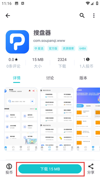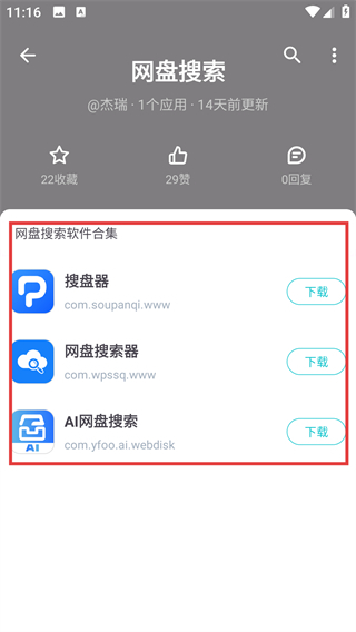 2、进入应用集页面后,能看到该集合下的软件(比如【搜盘器】),点击软件就能进入它的详情页面哦。